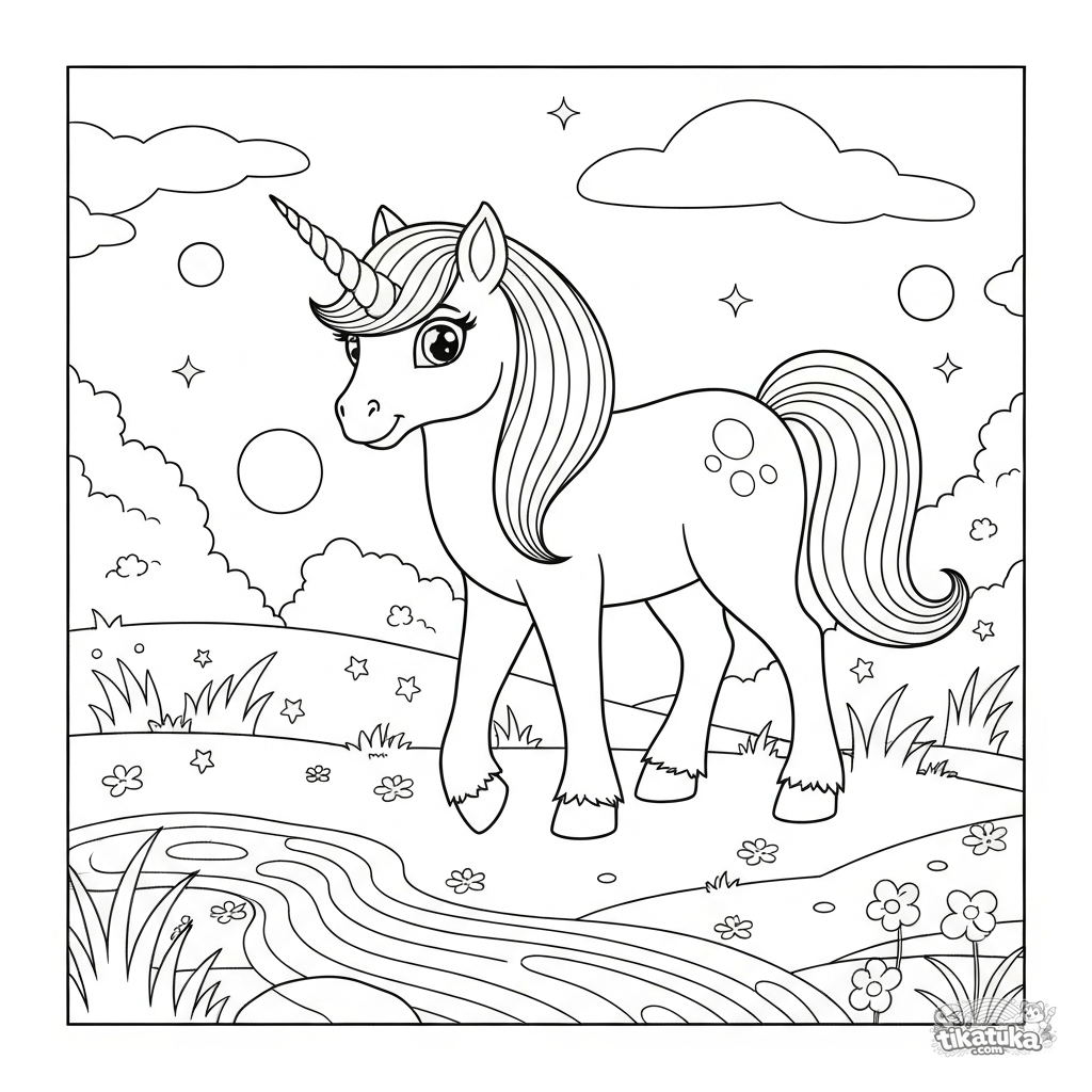Página para colorear de un poni unicornio mágico pastando en un prado encantado. Para niños de 3 a 6 años. Escena con flores y arroyo.