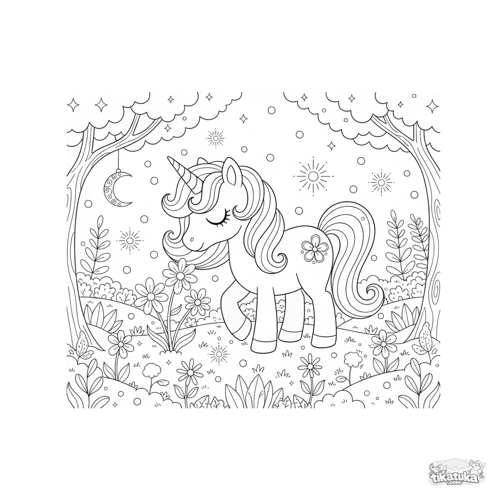 Página para colorear intrincada de un poni unicornio mágico en un prado encantado. Para niños de 8-12 años. Muchos detalles.