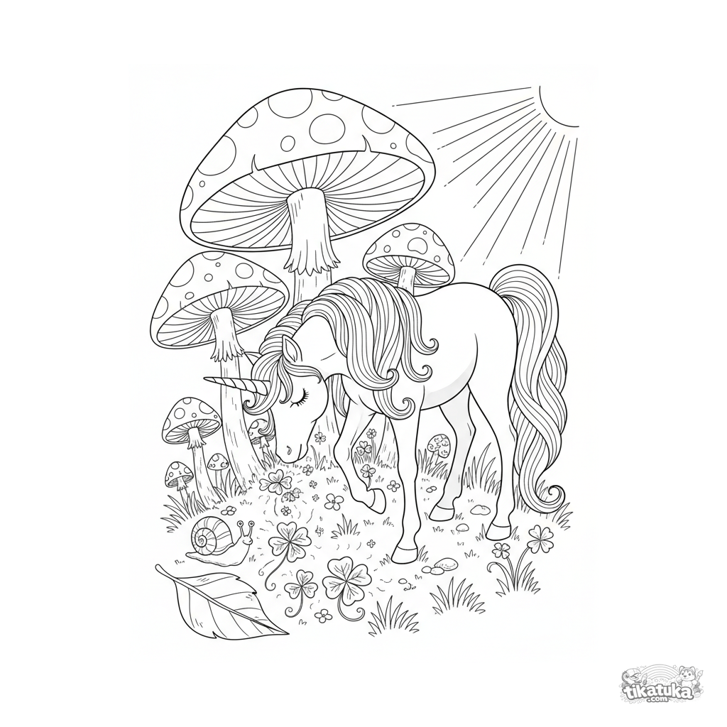 Página para colorear difícil para niños de 8 a 12 años: un unicornio realista pace entre setas gigantes en un bosque encantado. Alto detalle: setas, caracol, magia.