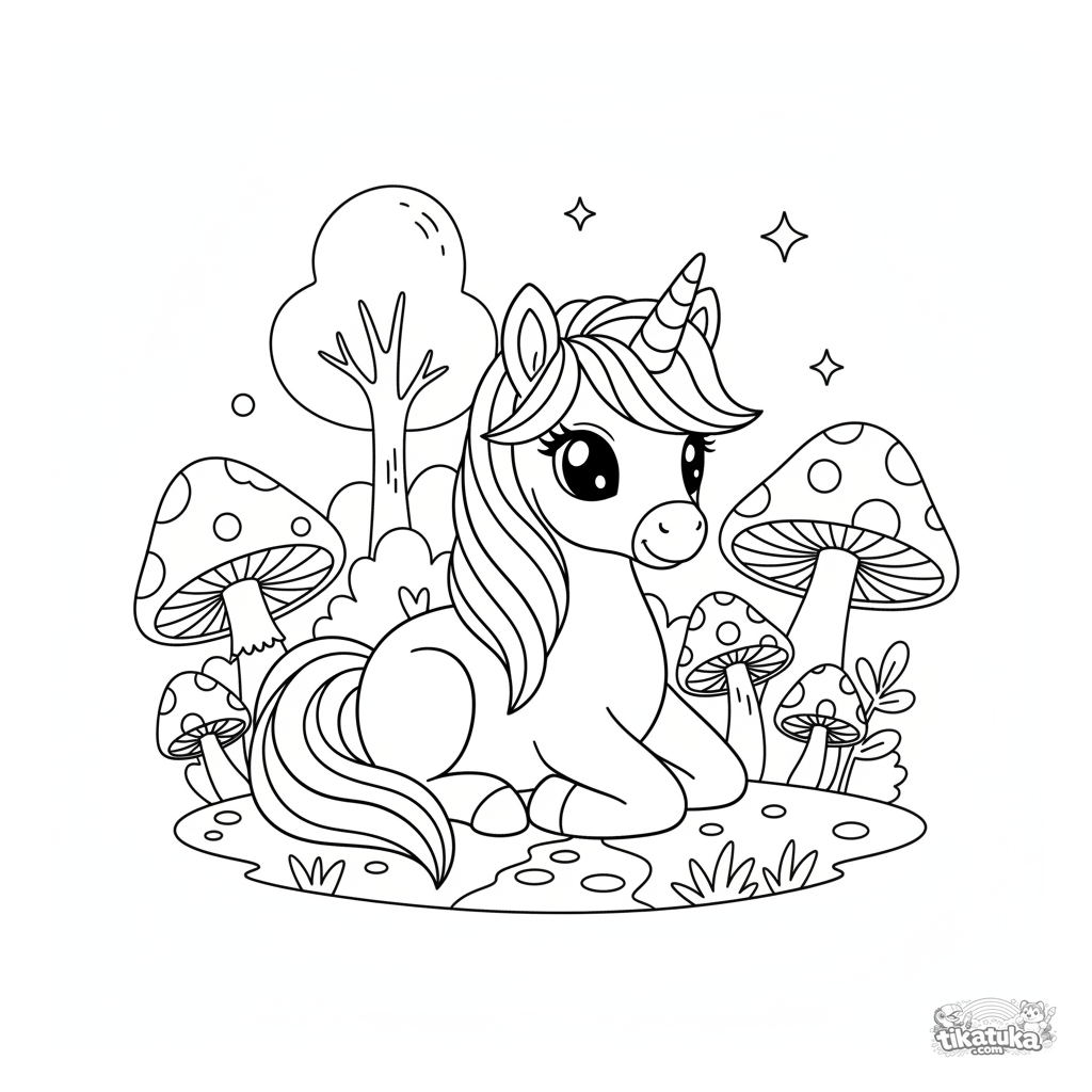 Página para colorear para niñas 4-6: un poni unicornio mágico descansa en un claro del bosque encantado entre hongos brillantes. Líneas hermosas y fluidas.