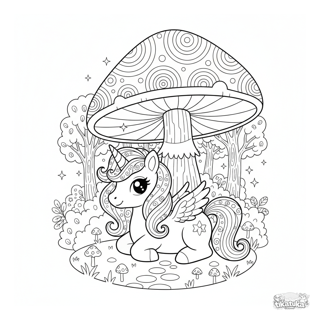 Página para colorear detallada para 7-12 años: un poni unicornio mágico descansa bajo un hongo brillante en un bosque encantado. Ricos detalles, destellos flotantes, crin fluida.