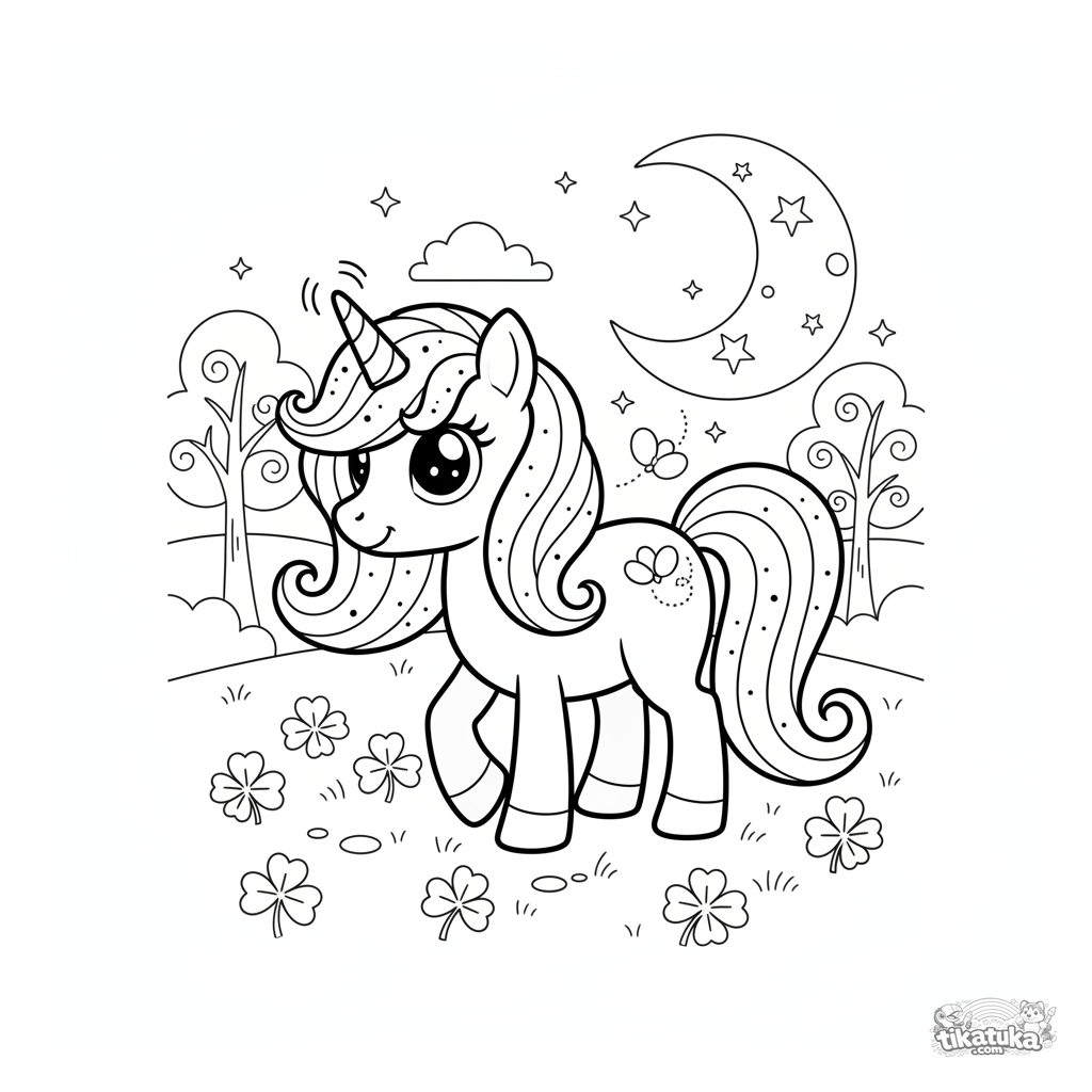 Página para colorear para niñas de 4-6 años: un mágico poni unicornio con crines brillantes pace en un prado a la luz de la luna. Escena mágica con luciérnagas.