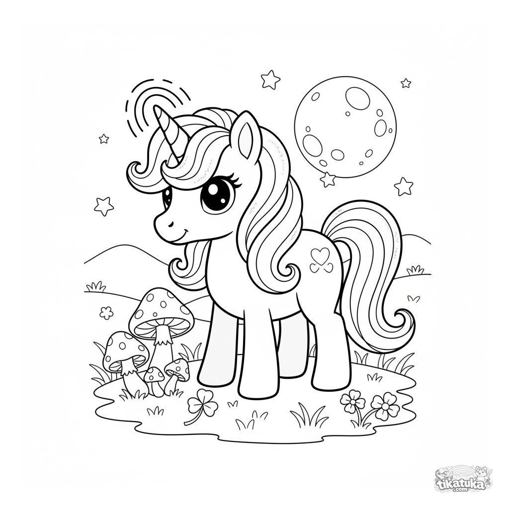 Página para colorear para niñas 4-6: un poni unicornio mágico con crines brillantes pace en un prado a la luz de la luna con hongos brillantes.