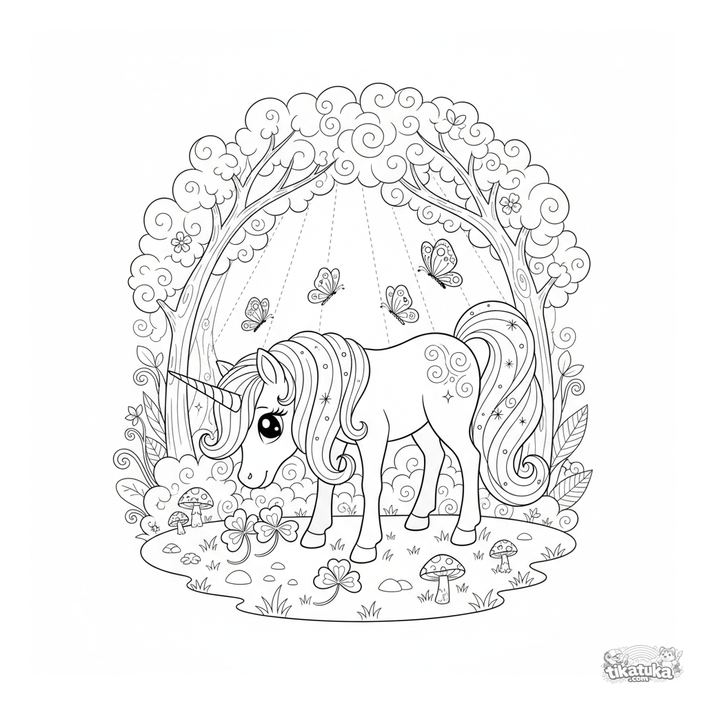 Página para colorear detallada para niñas 7-12: un poni unicornio mágico con crín brillante pasta en un claro del bosque. Rico detalle y fondo.
