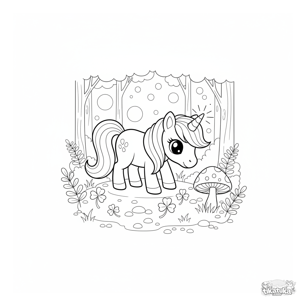 Página para colorear de un poni unicornio mágico pastando en un claro de bosque encantado junto a una seta brillante. Para niñas de 4 a 6 años.