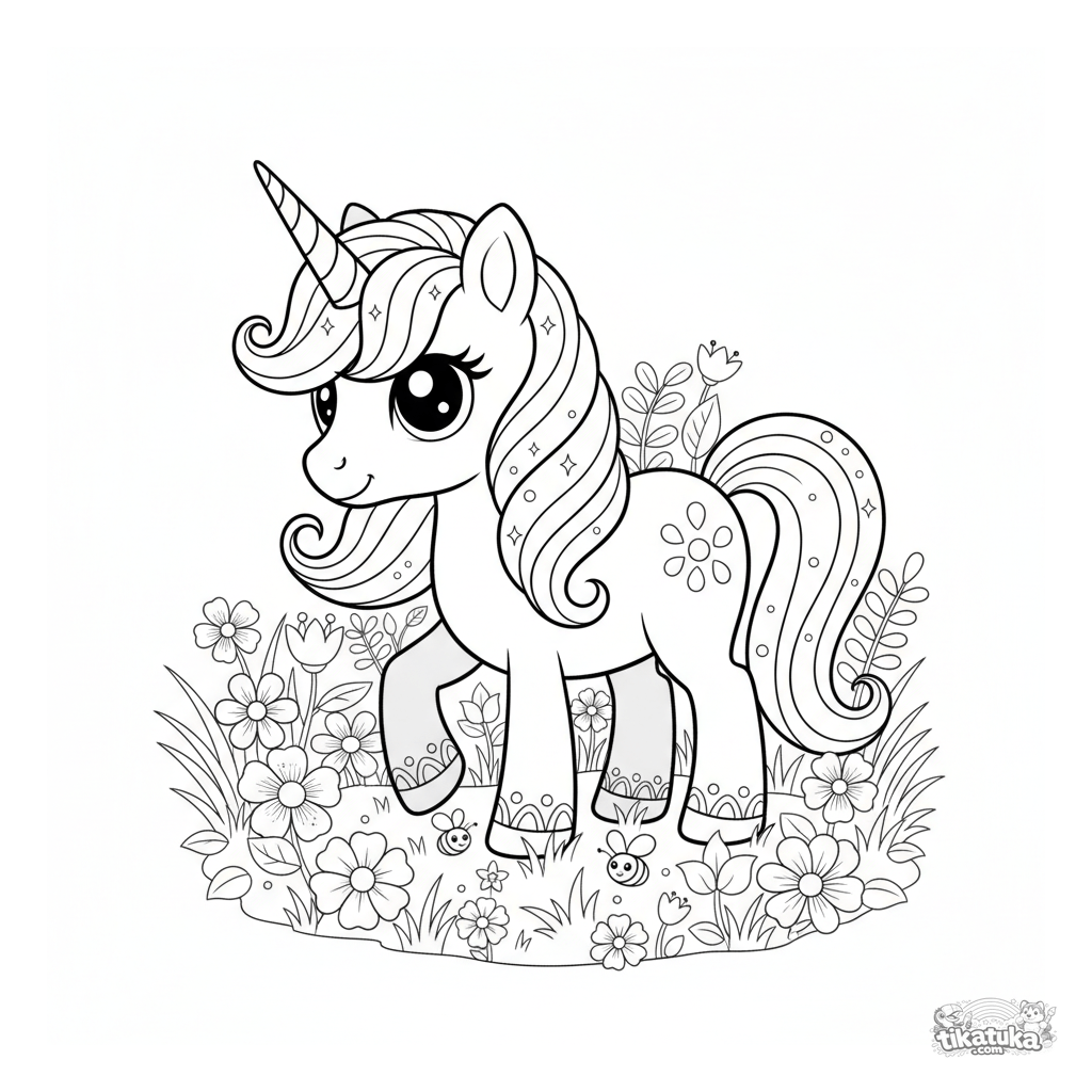 Página para colorear de un poni unicornio mágico con crin arcoíris pastando en un prado encantado. Para niños de 6 a 9 años. Muchos detalles para colorear.