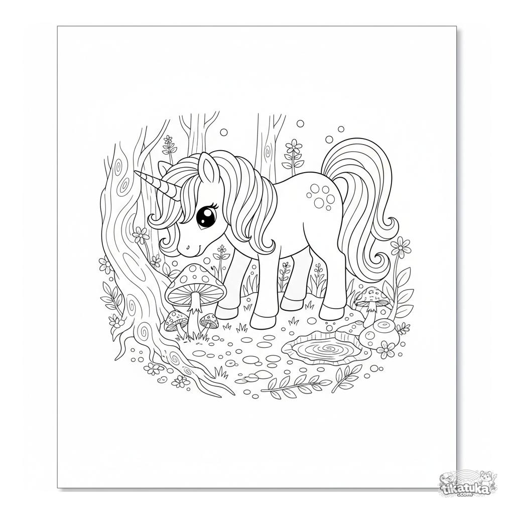 Página para colorear de un poni unicornio mágico pastando entre hongos brillantes en un bosque encantado. Para niños de 6 a 9 años.
