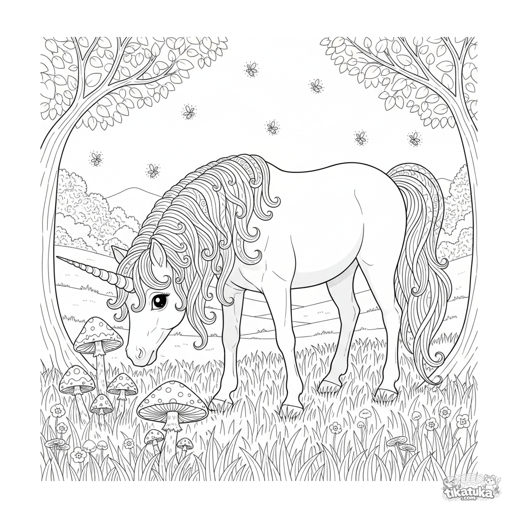 Página para colorear detallada para niños mayores: un poni unicornio mágico pastando bajo la luz de la luna cerca de hongos brillantes. Alto detalle para 7-12 años.