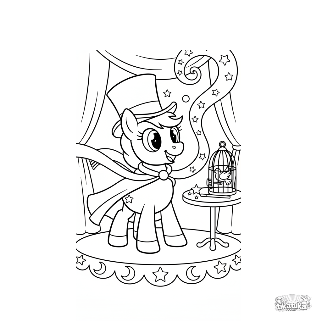 Página para colorear divertida para niños 4-6 años: un pony mago saca un pañuelo sin fin de un sombrero. Estilo retro, formas simples, historia graciosa.