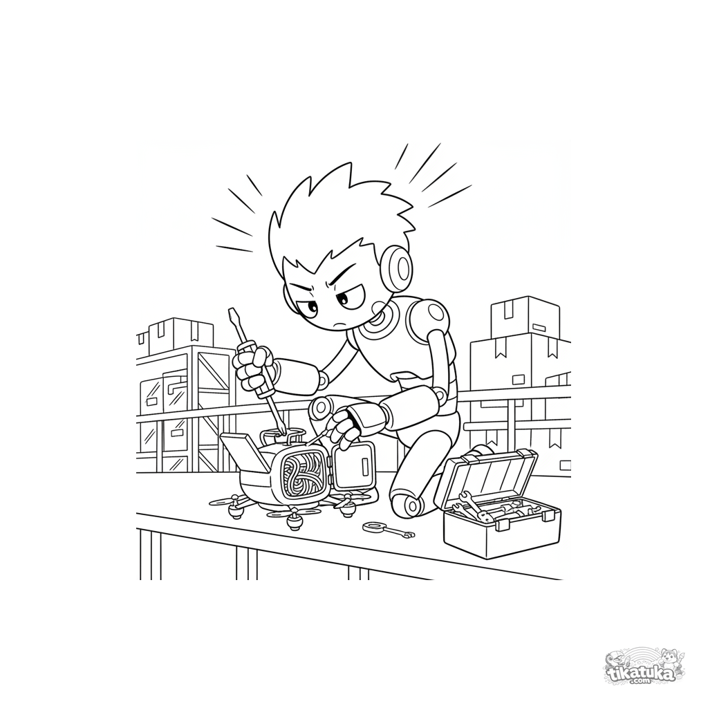 Página para colorear para niños 7-9: un robot mecánico estilo manga repara con atención un dron de carga roto en una pasarela de almacén. Líneas dinámicas, caja de herramientas abierta.