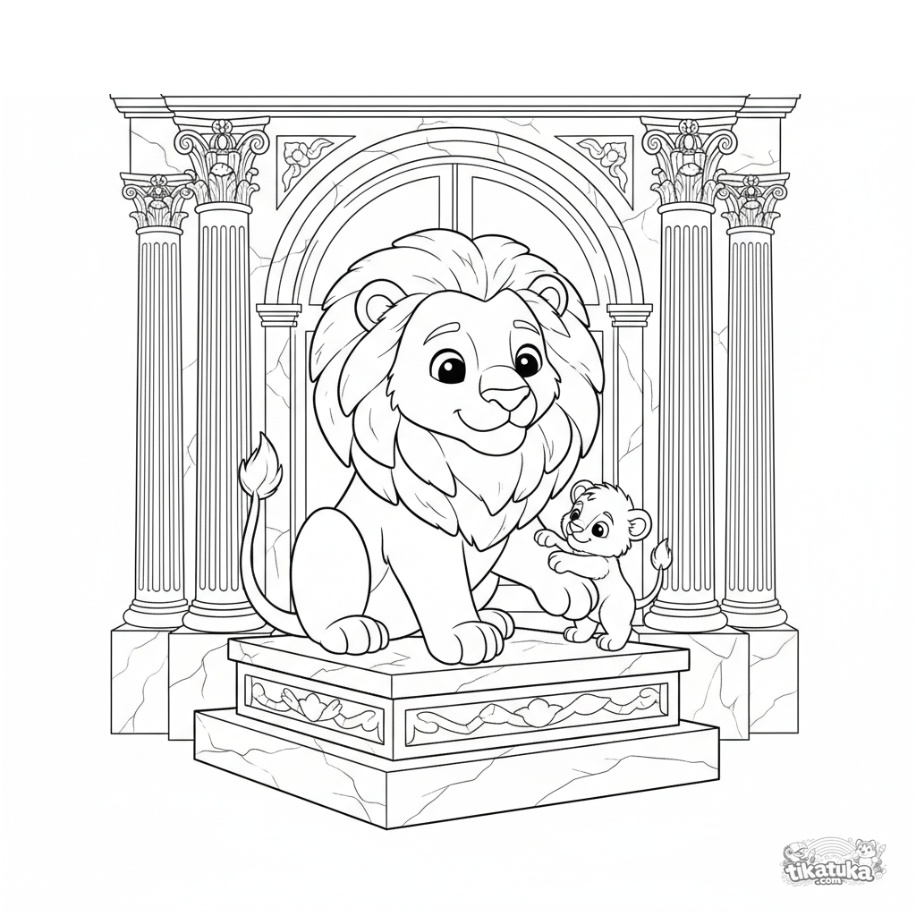 Página para colorear para niños de 4-8 años: un majestuoso león guardián en la entrada de un palacio de mármol observa a su cachorro juguetón. Escena cálida estilo libro de cuentos.