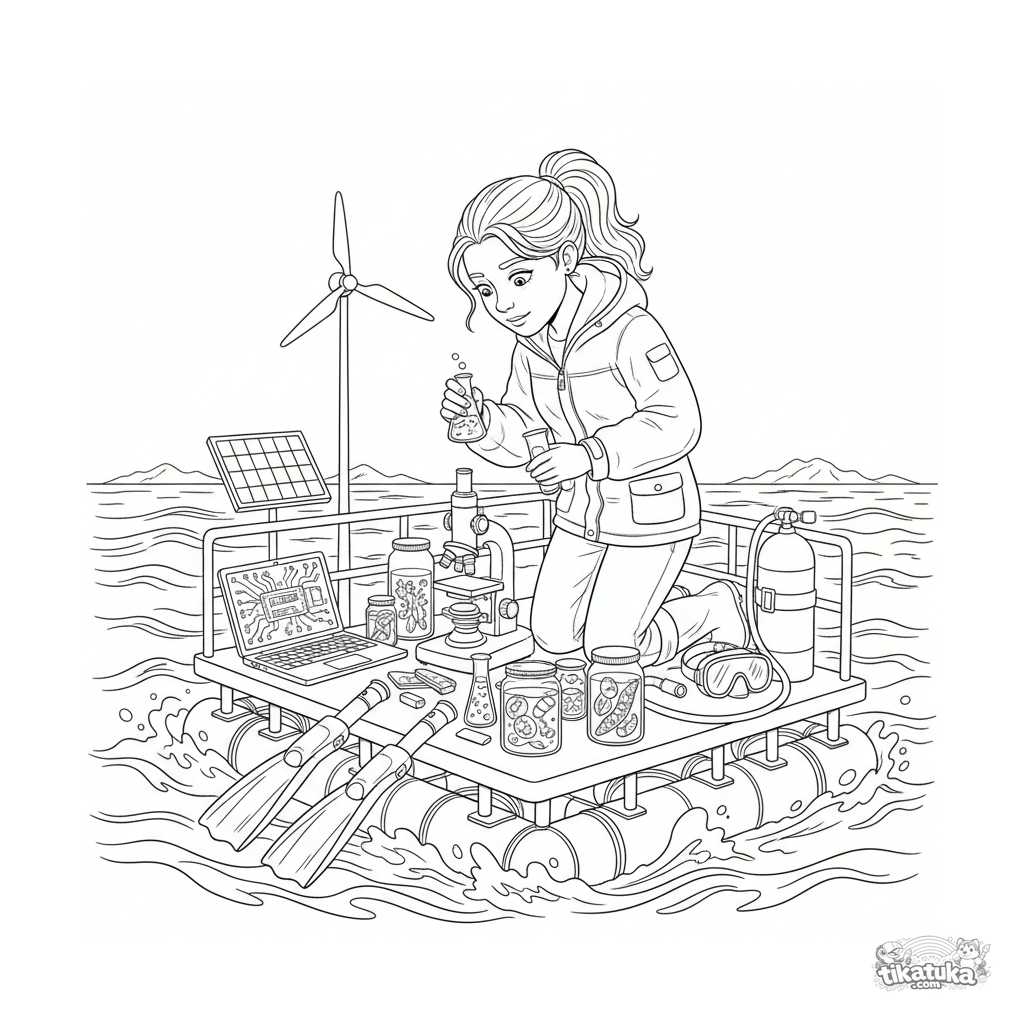 Página para colorear para 10-12 años: laboratorio de investigación marina en una plataforma flotante. Un científico examina muestras de agua rodeado de equipos. Escena compleja y detallada.