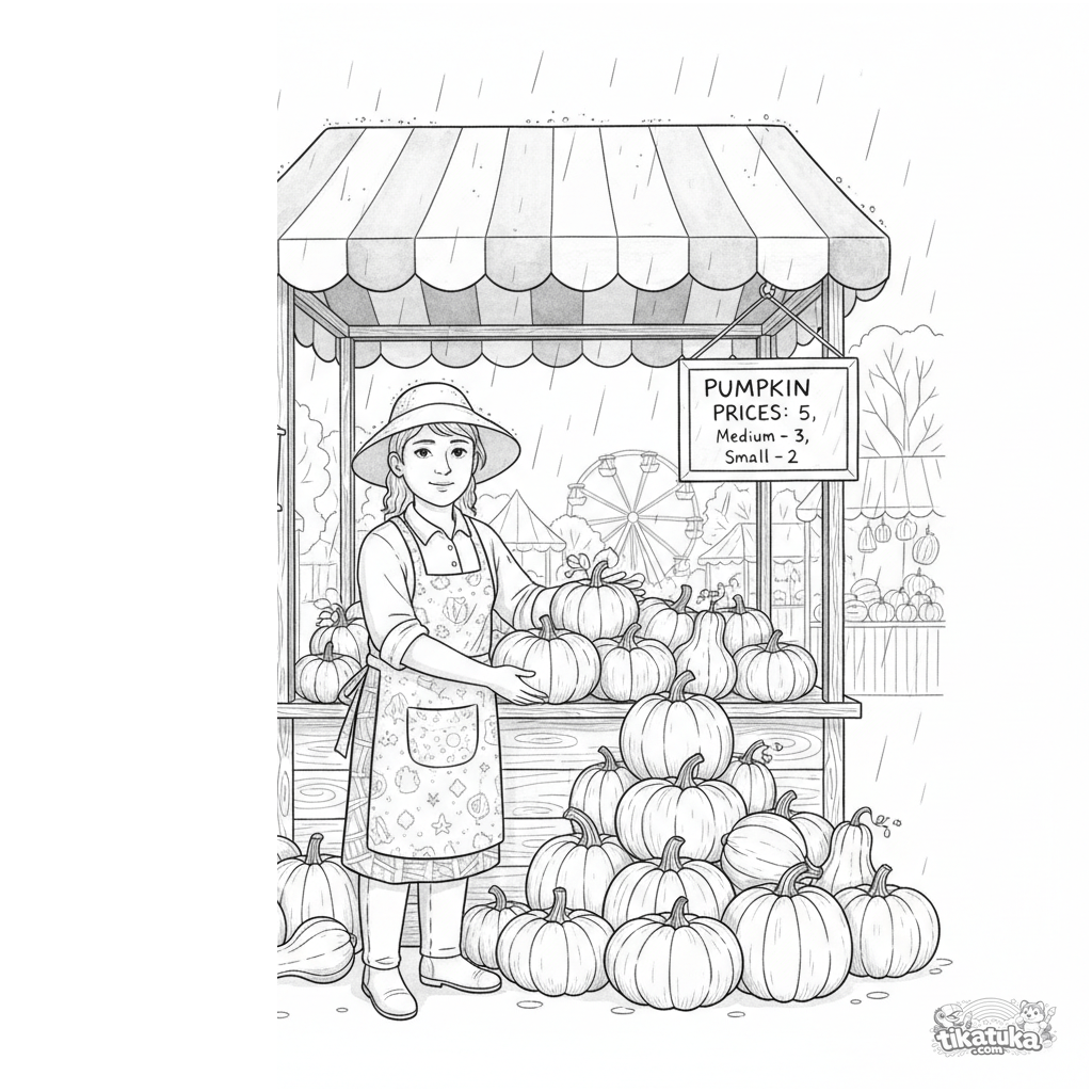 Página para colorear detallada para niños de 10-12 años: un vendedor cubre calabazas con una lona en un mercado de otoño lluvioso. Estilo acuarela, texturas.