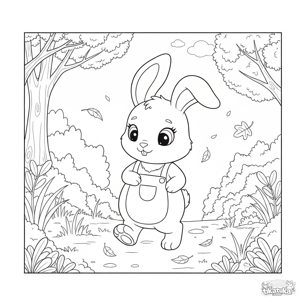La conejita Martha pasea curiosa por un bosque otoñal, entre hojas doradas. Descarga, imprime o colorea online esta tierna escena.