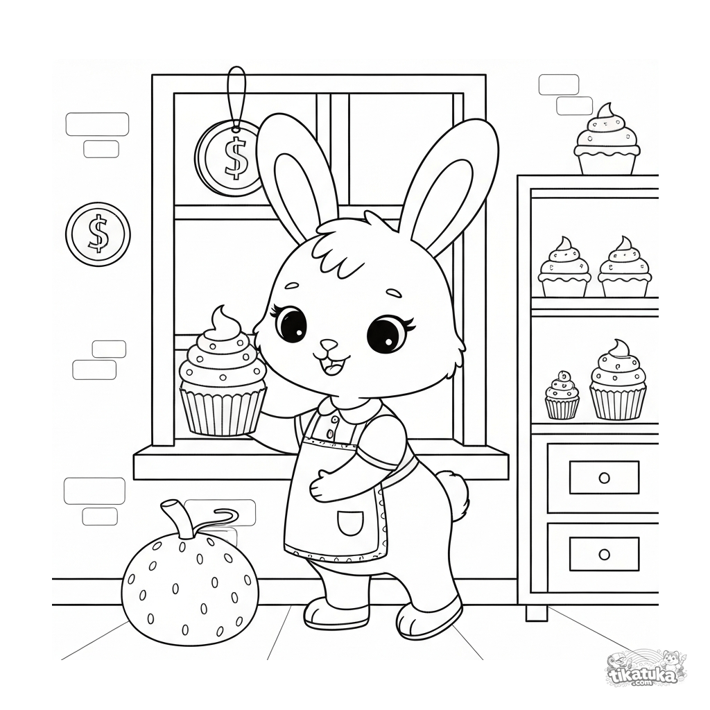 La conejita panadera Martha crea su primer escaparate con un cupcake decorado y una moneda. Descarga, imprime o colorea online este dulce dibujo.