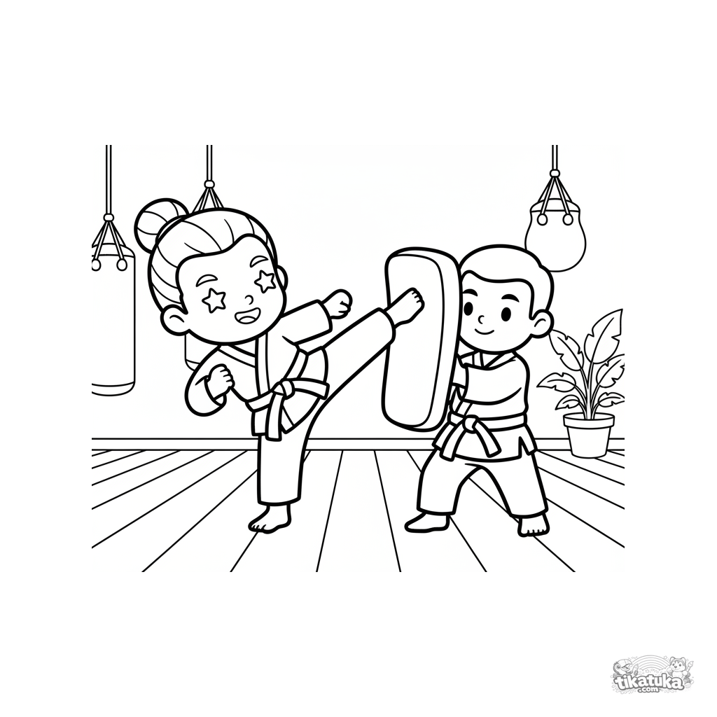 Página para colorear para niños 4-6: un artista marcial en un gi blanco realiza una patada lateral alta contra un objetivo de práctica en un dojo. Escena de poder y disciplina.