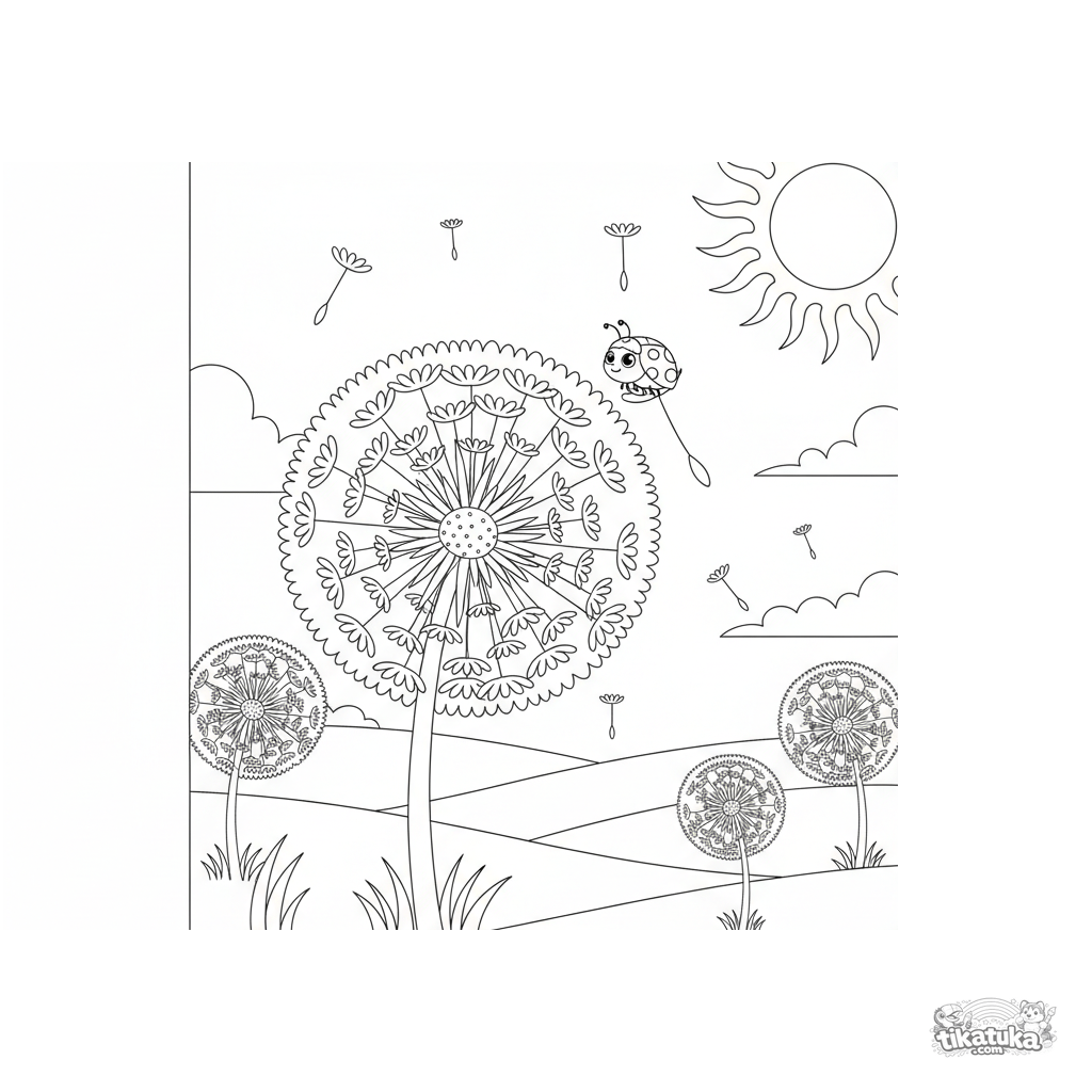 Página para colorear de un prado mágico con dientes de león gigantes y una mariquita diminuta. Para niños de 4 a 6 años.