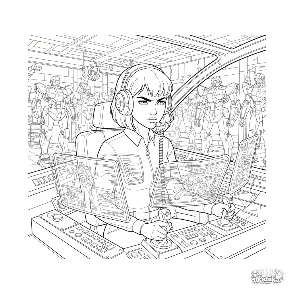 Compleja página para colorear estilo anime: un piloto dentro de la cabina de un mecha gigante ejecuta diagnósticos. Escena muy detallada para niños de 10-12 años.