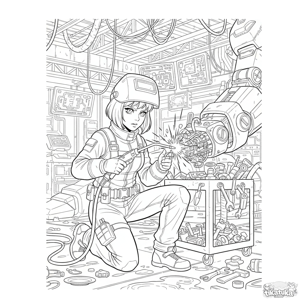 Página para colorear anime detallada: una estudiante piloto repara el brazo de un robot gigante en un hangar. Para 10-12 años.