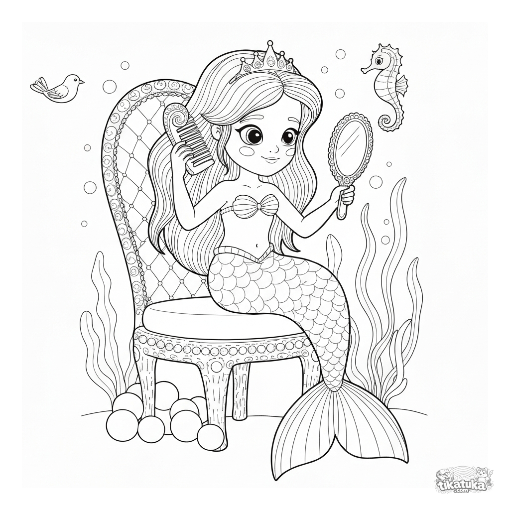 Página para colorear de una princesa sirena peinándose en un trono de coral. Para niños de 6 a 9 años.