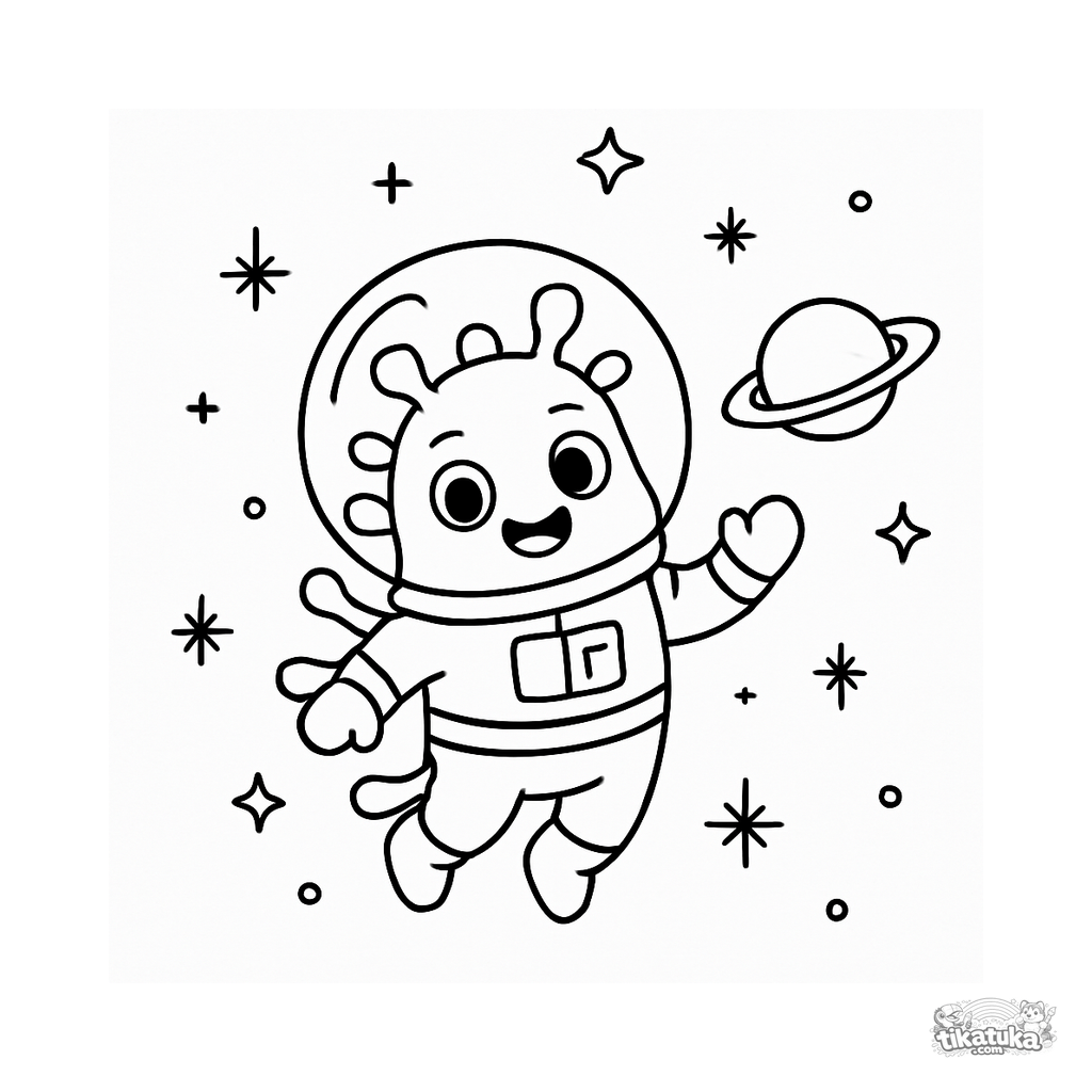 Página para colorear para niños. Un microbio feliz con casco de burbuja y traje espacial flotando junto a un planeta con anillos en el espacio. Descarga gratis.