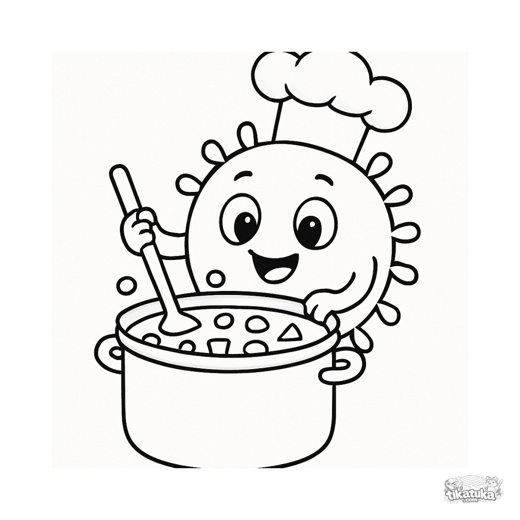 Página para colorear para niños. Microbio alegre con gorro de chef preparando sopa en una olla grande con formas de nutrientes coloridos. Descarga gratis.