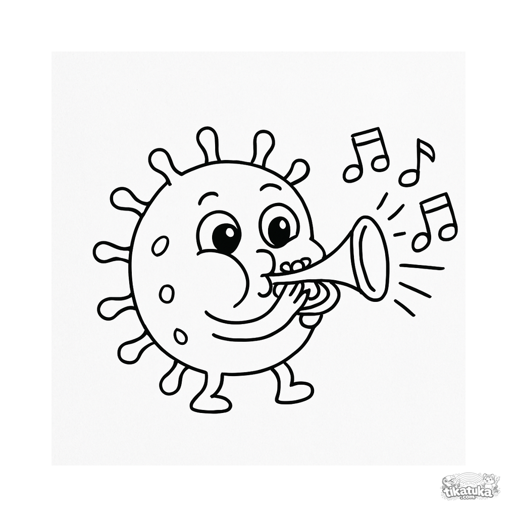 Página para colorear para niños. Un microbio alegre con mejillas infladas toca una trompeta dorada brillante con notas musicales coloridas. Descarga gratis.