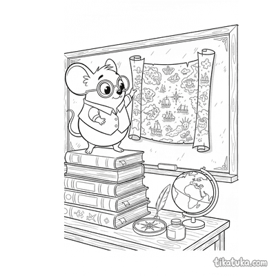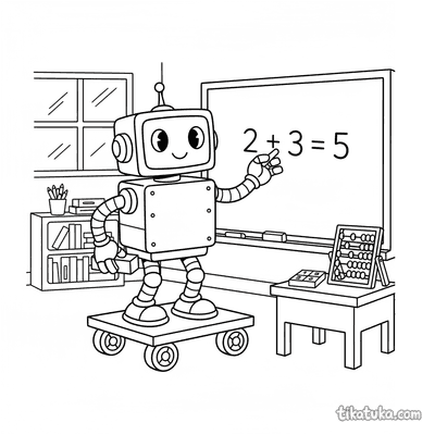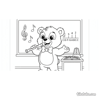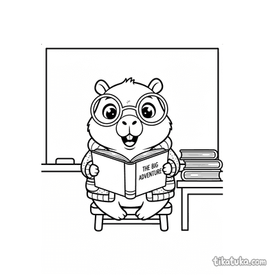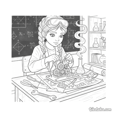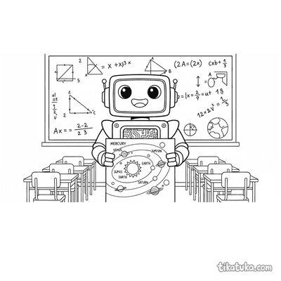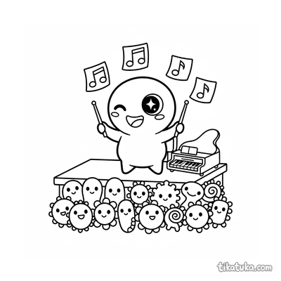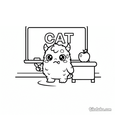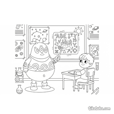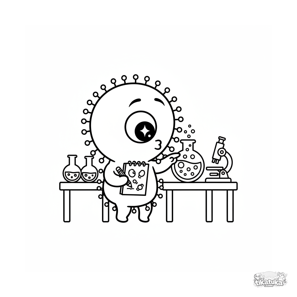 Página para colorear muy simple para niños pequeños 2-3: un científico microbio mira dentro de un matraz en el aula. Cabeza enorme, detalles mínimos, estilo chibi.