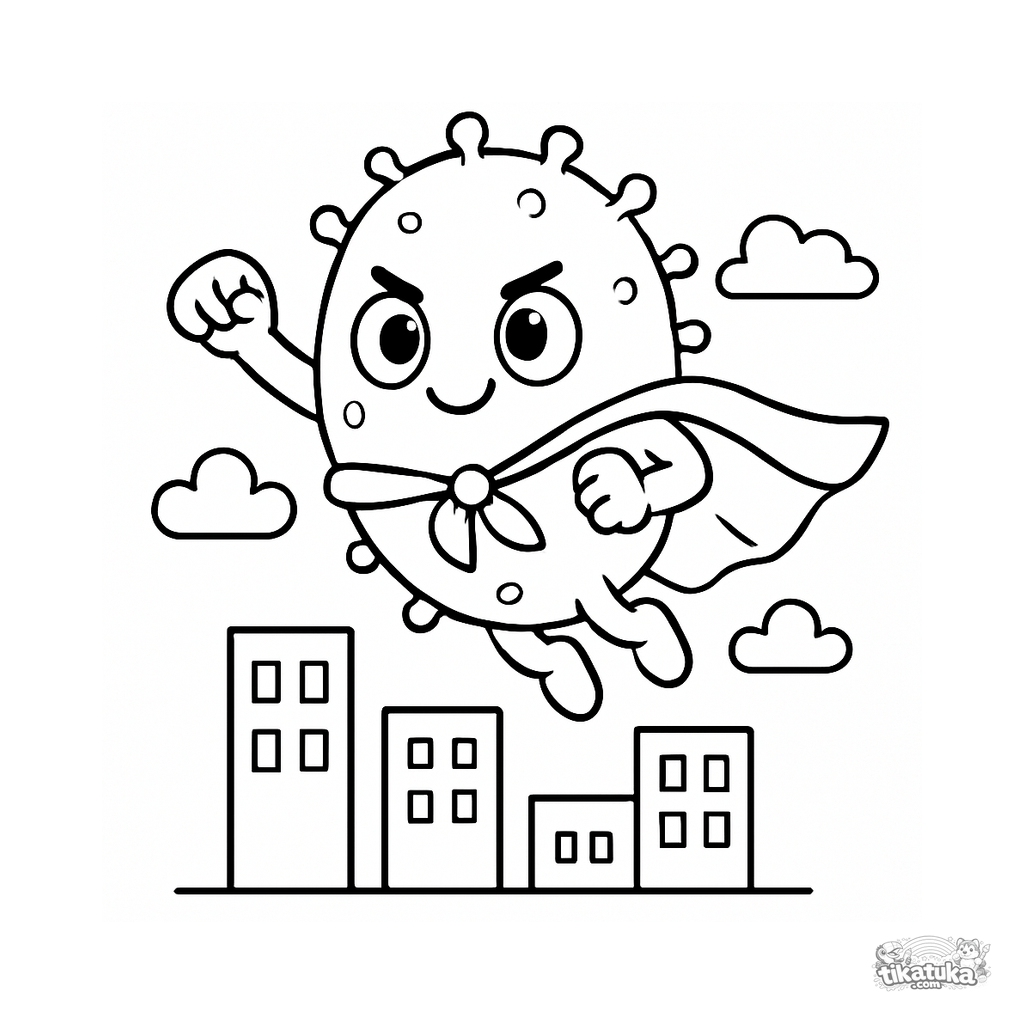 Página para colorear para niños. Un valiente microbio superhéroe con capa roja vuela sobre edificios pequeños con el puño extendido. Descarga gratis.