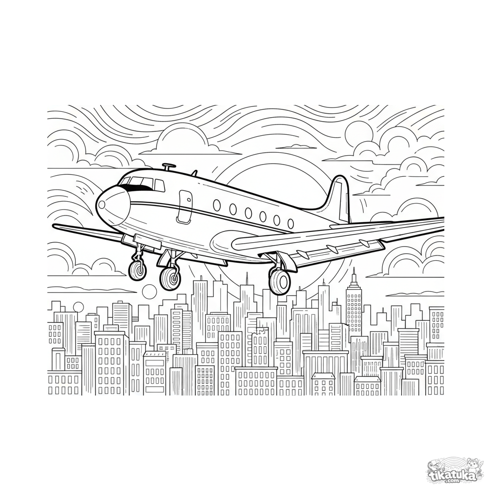 Página para colorear para preadolescentes de 7-9 años: un avión de pasajeros de los años 50 se aproxima para aterrizar sobre una ciudad al atardecer. Detalle moderado y fondo interesante.