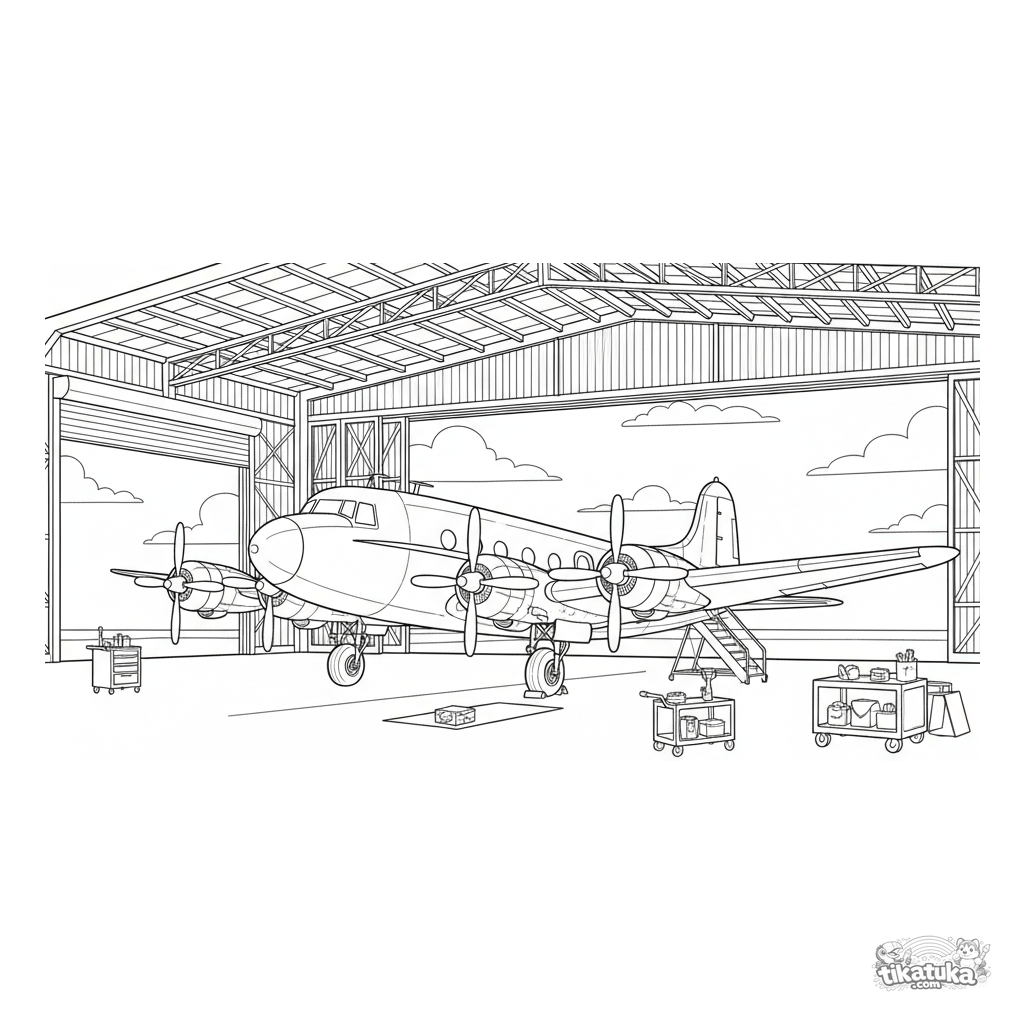 Página para colorear de un elegante avión de pasajeros de los años 50 estacionado en un hangar abierto. Se ven escalera y carritos. Para niños de 4-6 años.