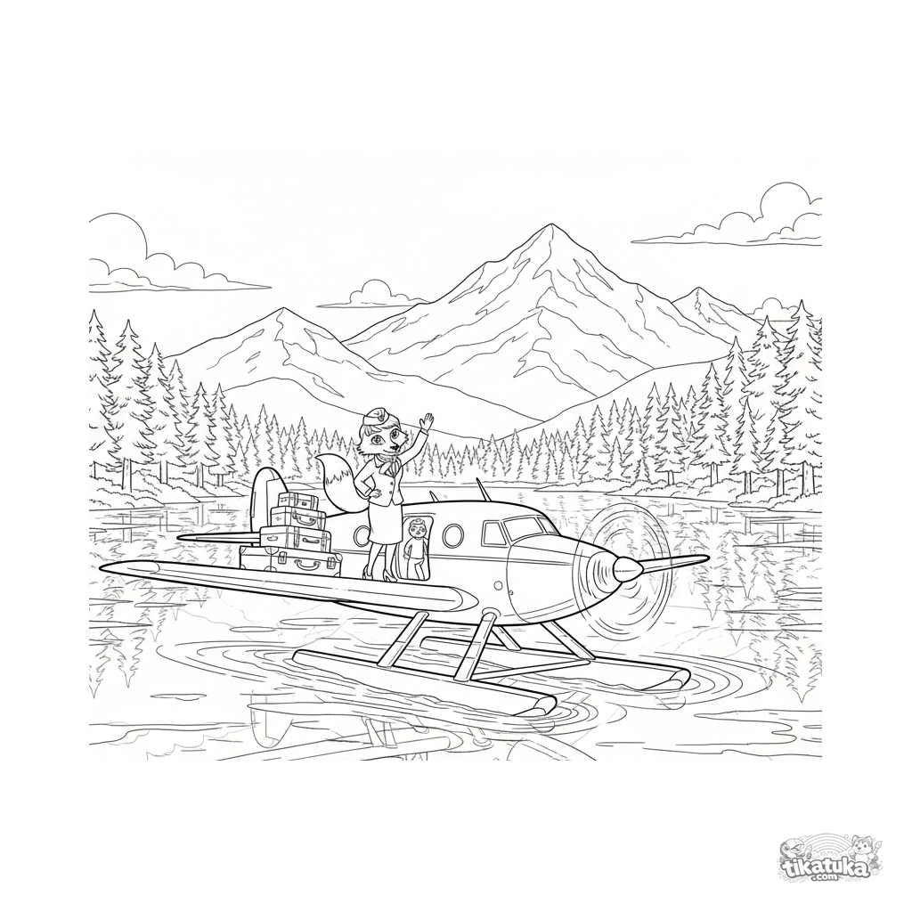 Página detallada para colorear para niños 10-12: un elegante hidroavión de pasajeros de mediados de siglo en un lago alpino. Una azafata zorro saluda.