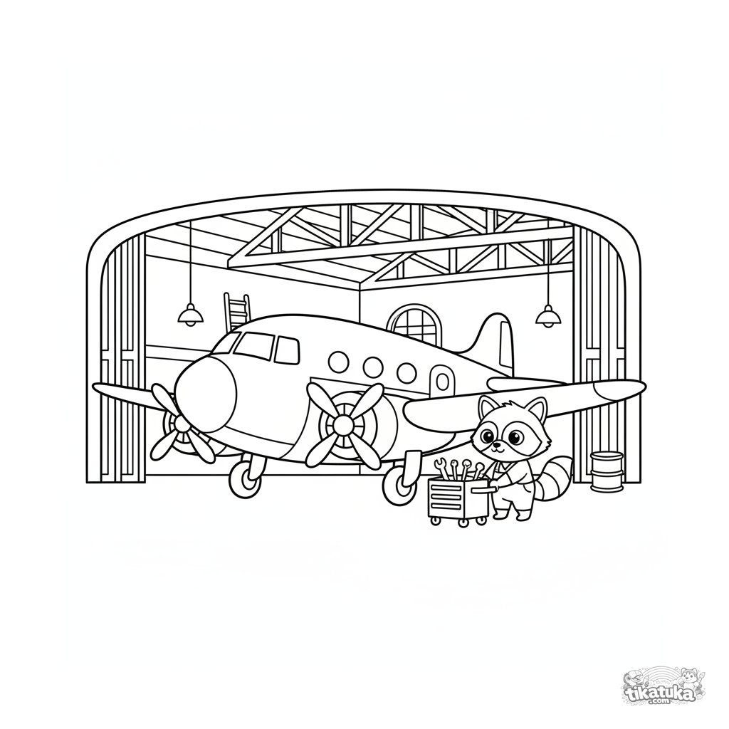 Página para colorear para niños de 7-9 años: un elegante avión de hélice de los años 50 en un hangar. Líneas limpias, detalles interesantes.