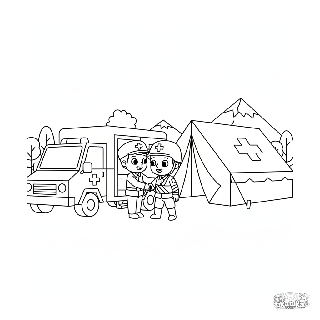 Página para colorear para niños 4-6 años: una ambulancia militar con una cruz roja está estacionada en una carpa de hospital de campaña. Un médico ayuda a un soldado vendado.