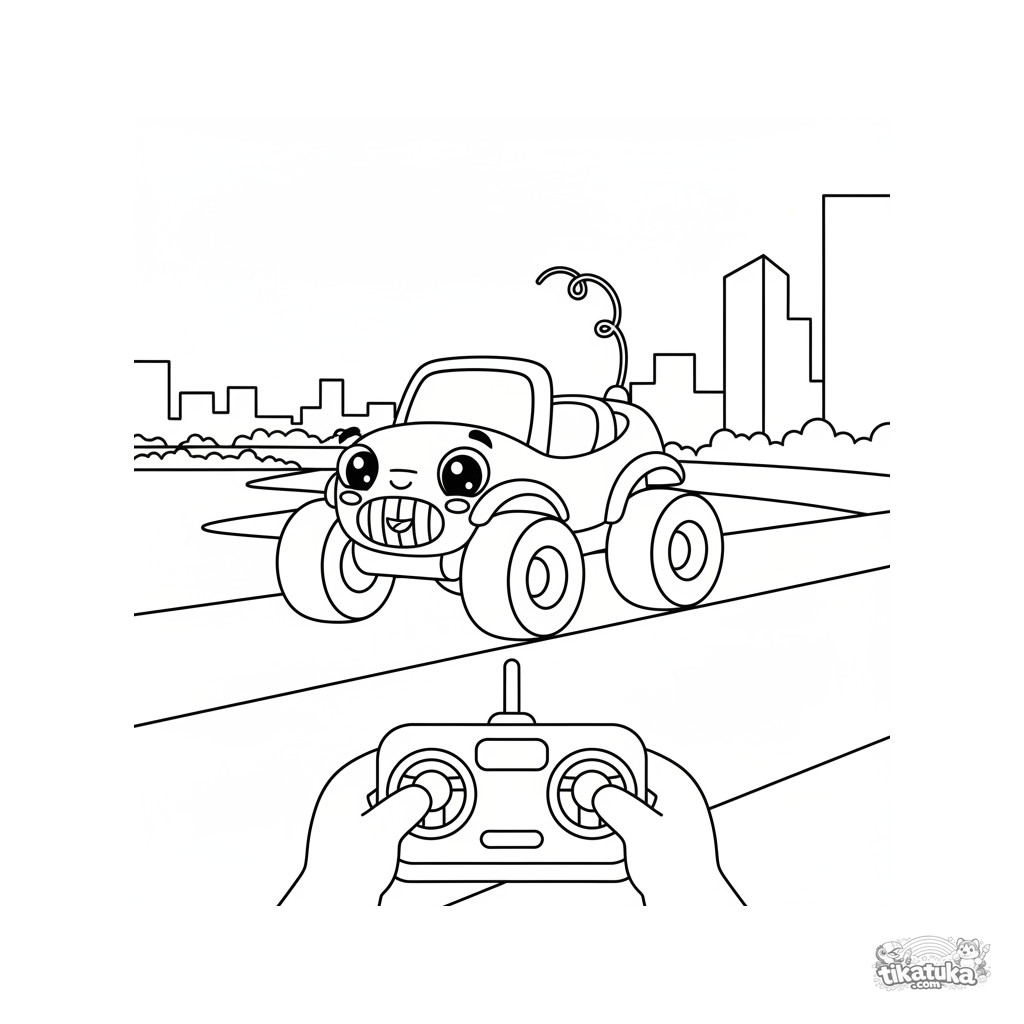 Página para colorear para niños pequeños: un pequeño coche de control remoto en la barandilla de un gran puente sobre un río.