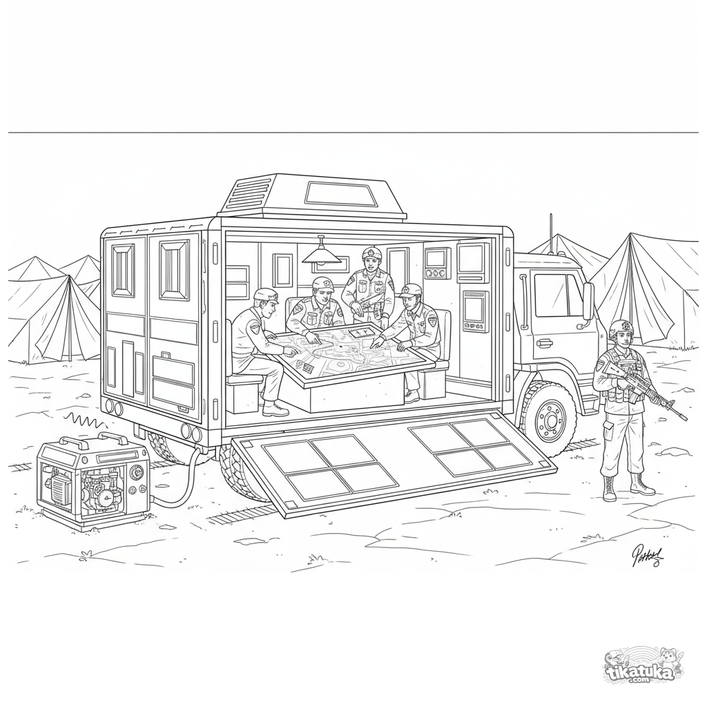 Página para colorear compleja de un centro de mando móvil con laterales expandidos. Para niños mayores de 10 a 12 años.