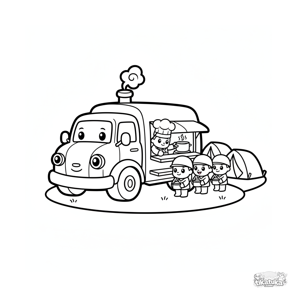 Página para colorear para niños pequeños de un camión de cocina de campaña. Para 2-3 años.