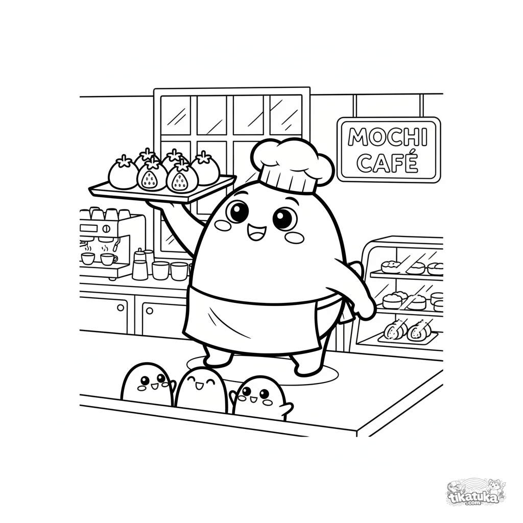 Página para colorear para niños 7-9: un chef mochi con gorro y delantal presenta una bandeja de mochi de fresa en una cafetería. Escena detallada.
