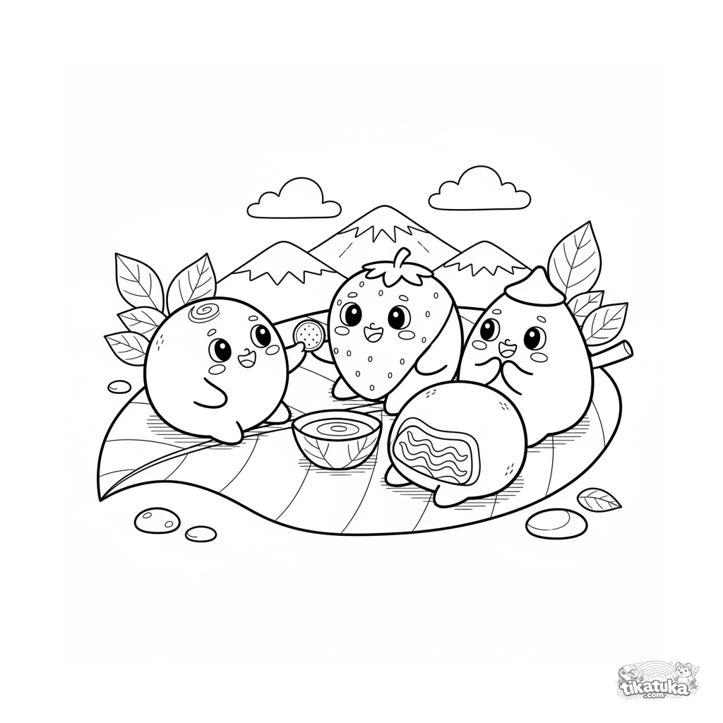 Página para colorear para preadolescentes de 7-9 años: un grupo amistoso de mochi variados haciendo un picnic en una hoja grande. Escena sobre amistad y golosinas.