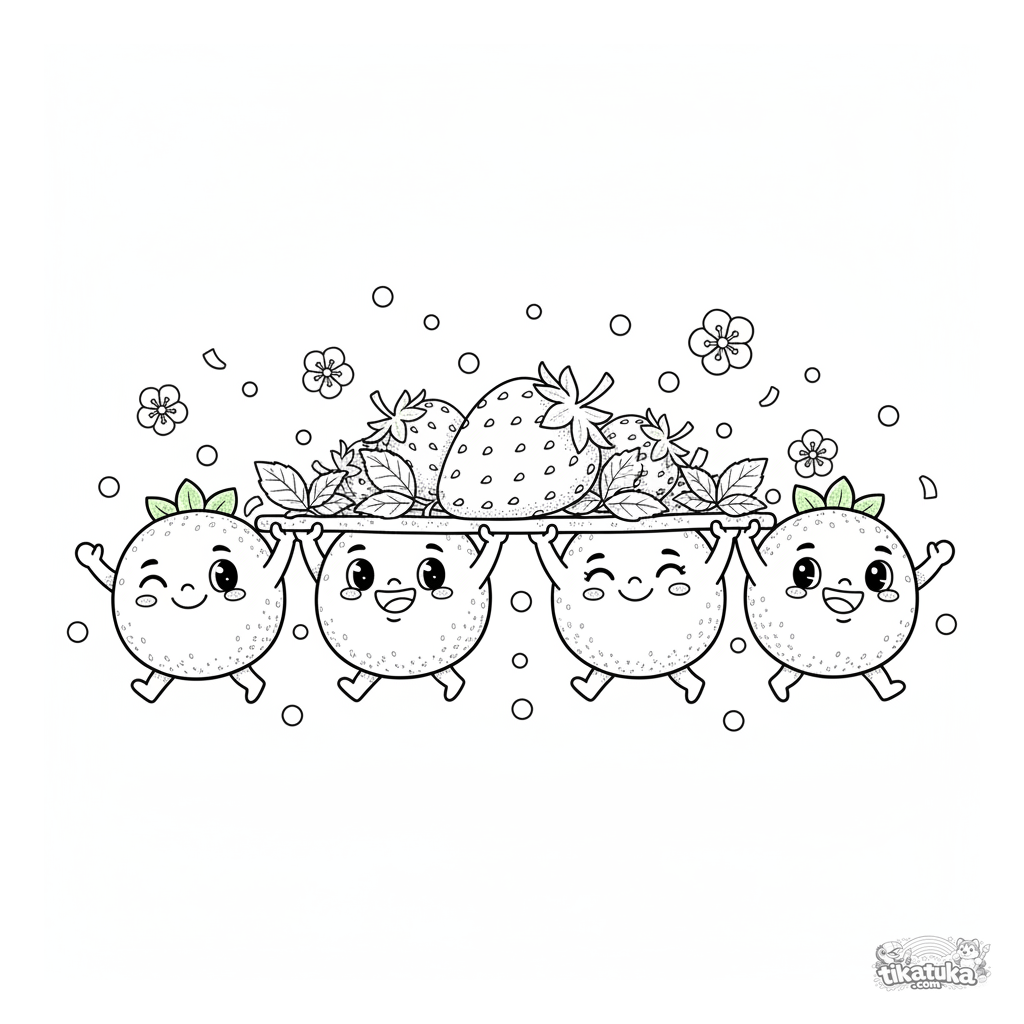 Página detallada para colorear para niños de 10-12 años: un desfile de mochi cargando una fresa gigante. Detalles realistas, ambiente festivo entre flores de fresa.