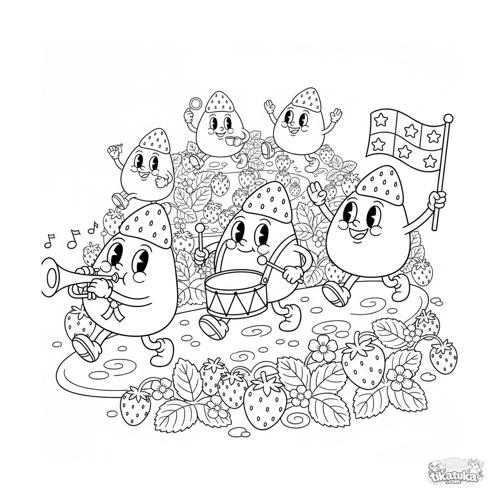 Página intrincada para colorear para niños de 10-12 años. Un desfile de mochi músicos marchando. Muchos detalles, instrumentos, poses dinámicas estilo retro.