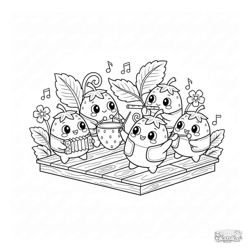 Página para colorear para niños de 7-9 años: una orquesta de mochi de fresa tocando instrumentos caseros en un escenario de madera. Estilo folclórico, múltiples personajes.