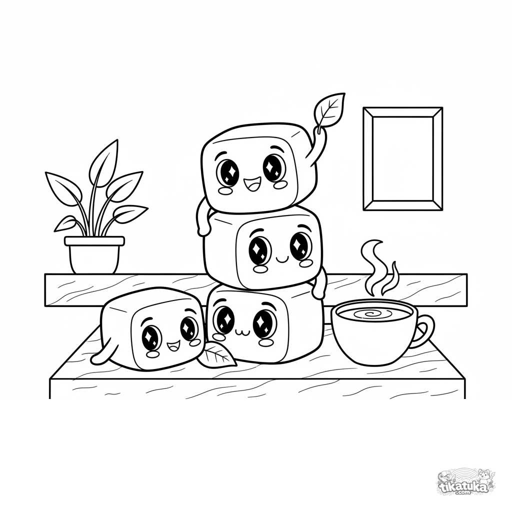 Página para colorear para preadolescentes 7-9: mochi juguetones construyendo una torre tambaleante en un mostrador de café. Escena dinámica con personajes expresivos.