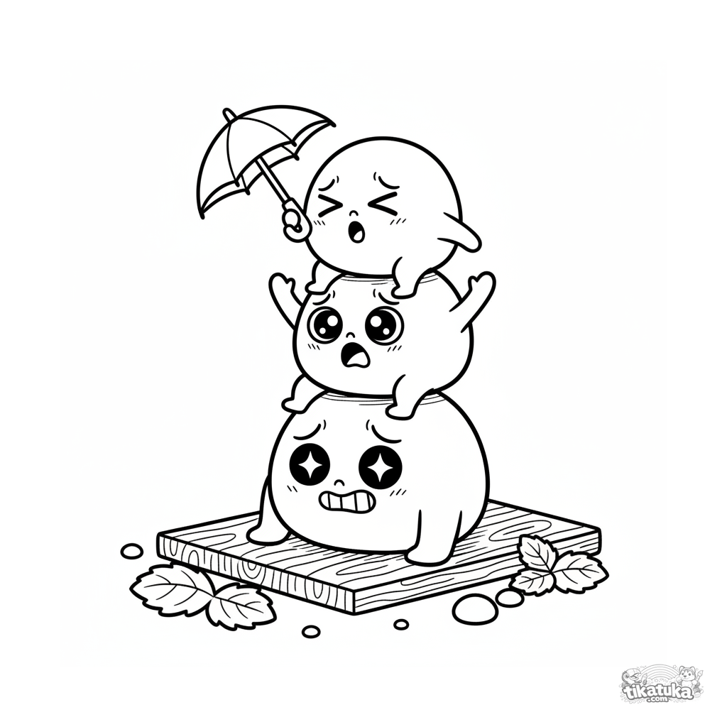 Página para colorear estilo años 90: una torre tambaleante de tres mochi intentando equilibrarse. Escena cómica para niños de 7-9 años.