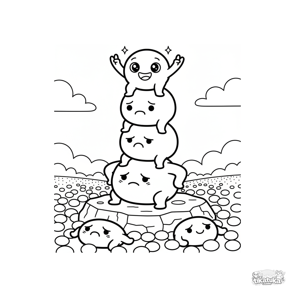 Página para colorear para preadolescentes de 7-9 años: una torre tambaleante de mochi variados tratando de mantener el equilibrio. Escena dinámica y divertida sobre trabajo en equipo.
