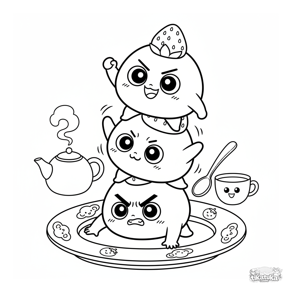 Página para colorear para niños de 4-6 años: mochi en un concurso divertido de apilar en un plato. Poses y expresiones faciales divertidas.