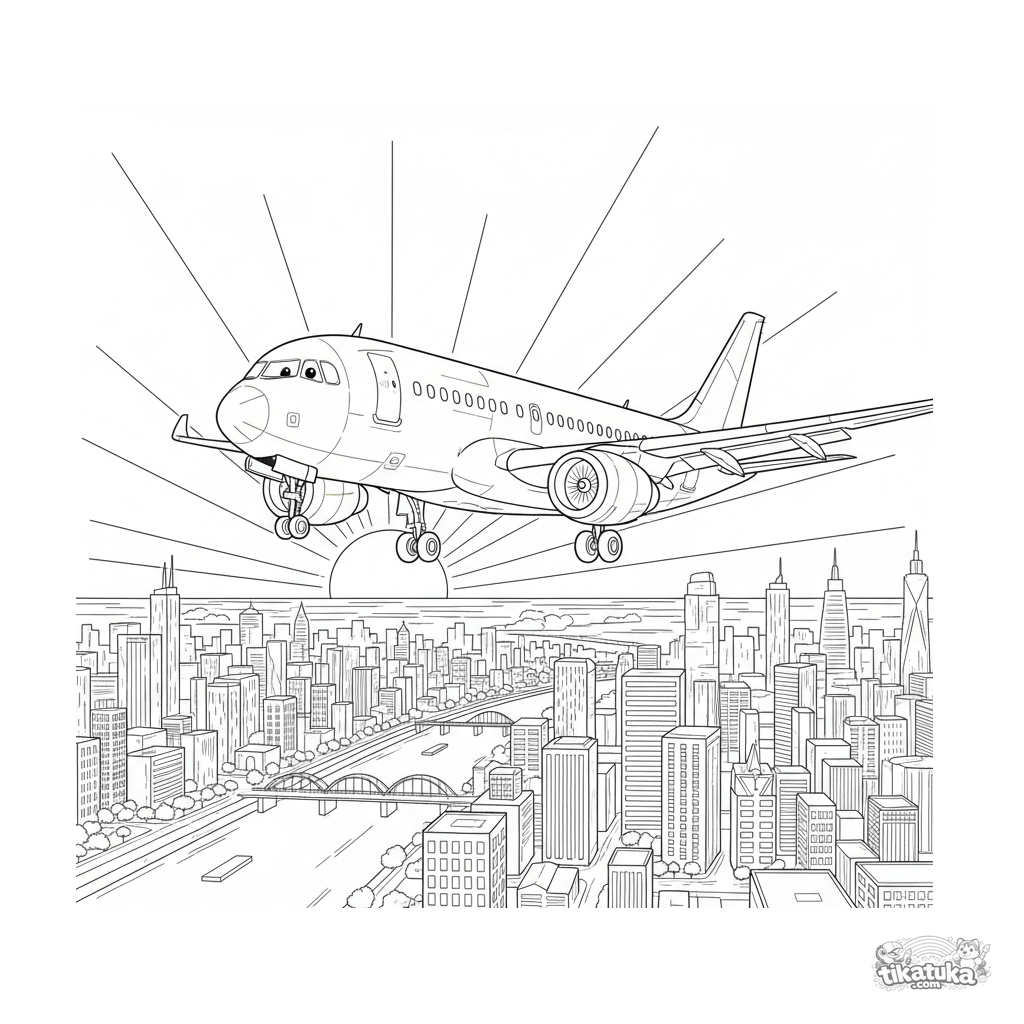 Página para colorear realista de un avión de pasajeros moderno en aproximación sobre una ciudad al atardecer. Para niños mayores de 10 a 12 años. Imagen detallada con tren de aterrizaje y flaps.