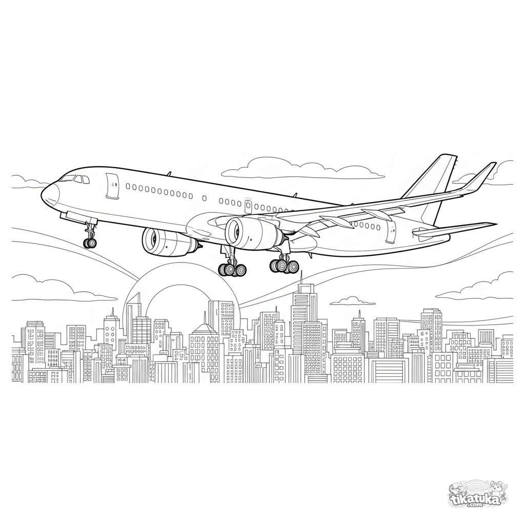 Una página para colorear detallada de un avión moderno en aproximación de aterrizaje sobre una ciudad al anochecer, con el tren de aterrizaje bajado y las luces de la ciudad. Para 10-12 años.