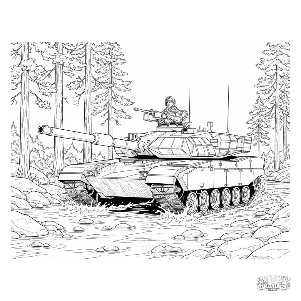 Página detallada para colorear de un tanque moderno cruzando un río. Para niños de 7 a 12 años. Escena con salpicaduras de agua, bosque y vehículo detallado.