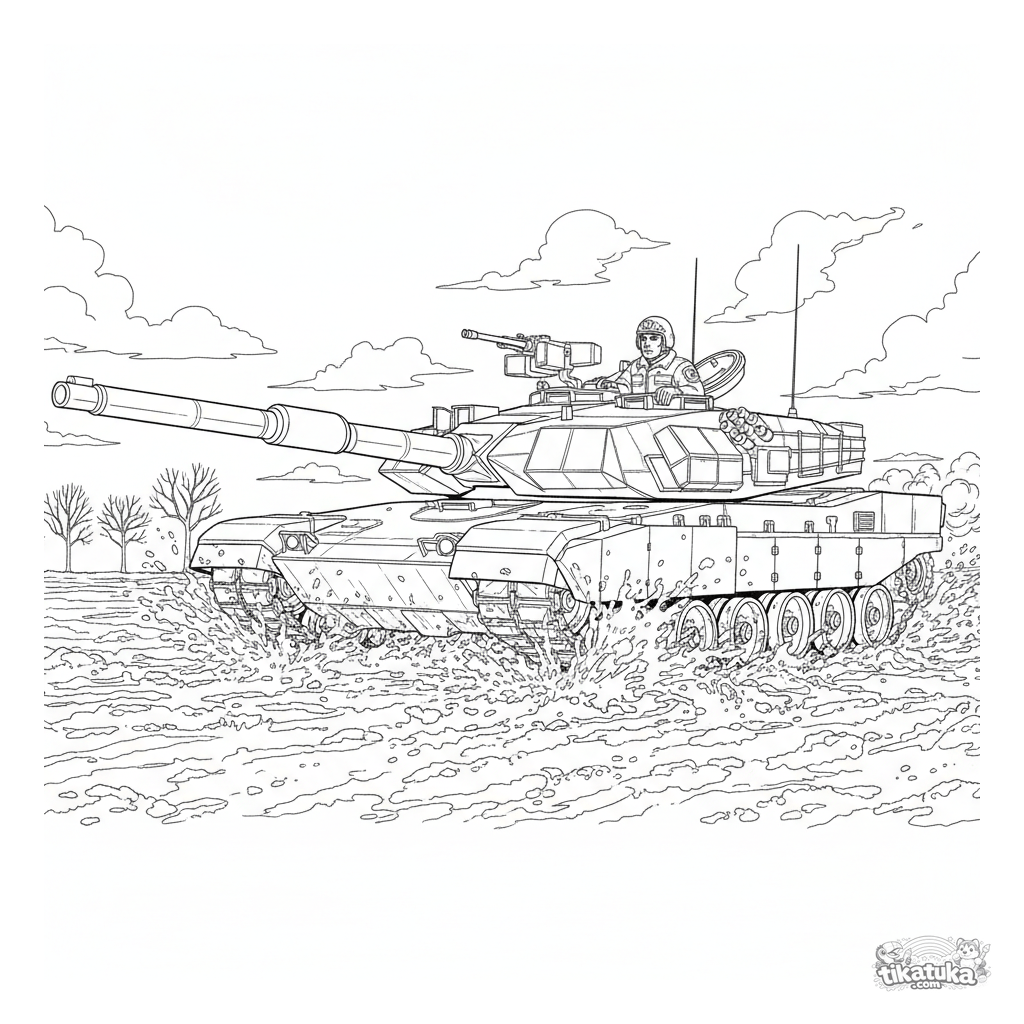 Página para colorear difícil para niños de 7 a 12 años con un tanque de combate moderno. El vehículo blindado cruza un campo fangoso, dejando marcas de orugas, con un comandante visible en la escotilla.